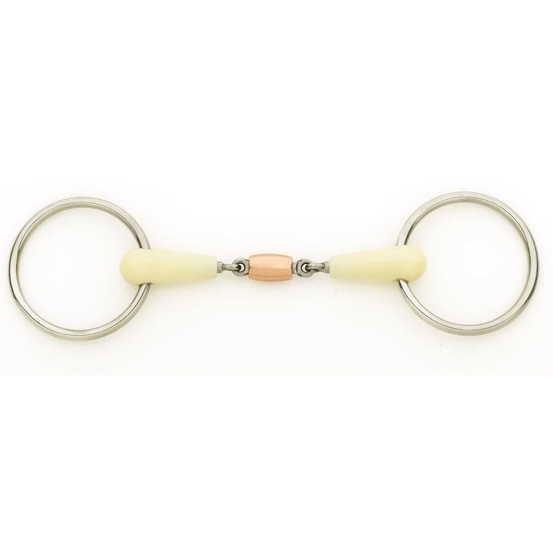 This bit features loose ring cheeks with a double jointed polymer and copper mouthpiece.