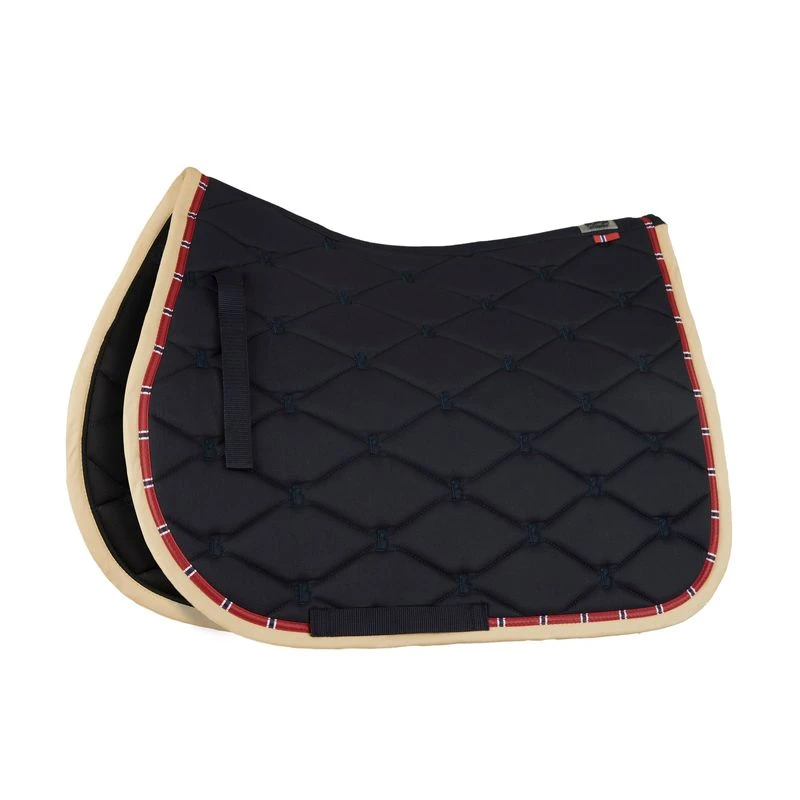 The B Vertigo Amory saddle pad is breathable and quick drying to provide comfort for your horse. Dust repellent properties keep it fresh. Classic colors and logo embroidery make for a luxurious look. Also available as all purpose version. Combine it with our B Vertigo Amory bandages and ear net for a full look!