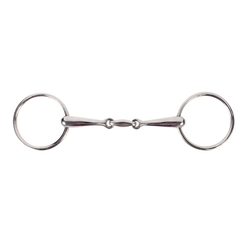 The flat lozenge style link also decreases the nutcracker effect that is inherent to single jointed snaffles. This design also allows for some level of independent action for each side of the bit. Loose ring cheekpieces increase play in the bit and encourage self carriage. This bit is legal for most dressage competitions where snaffles are allowed.