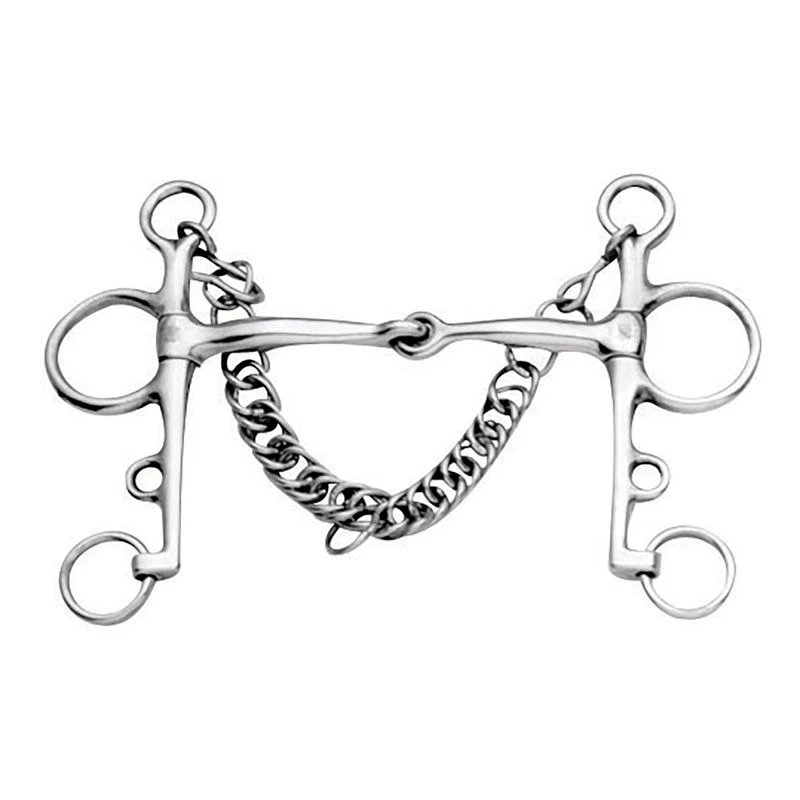 The top rein provides snaffle pressure to the tongue and corners of the mouth, while the bottom rein increases leverage and curb chain pressure. The single joint applies a nut cracker action which applies pressure to the tongue, the bars of the mouth and the horse’s palate.