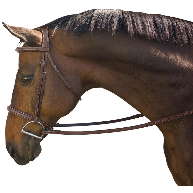 The M. Toulouse Platinum Liza/Camden Snaffle Hunter Bridle is crafted in fine English leather with raised fancy stitching.
