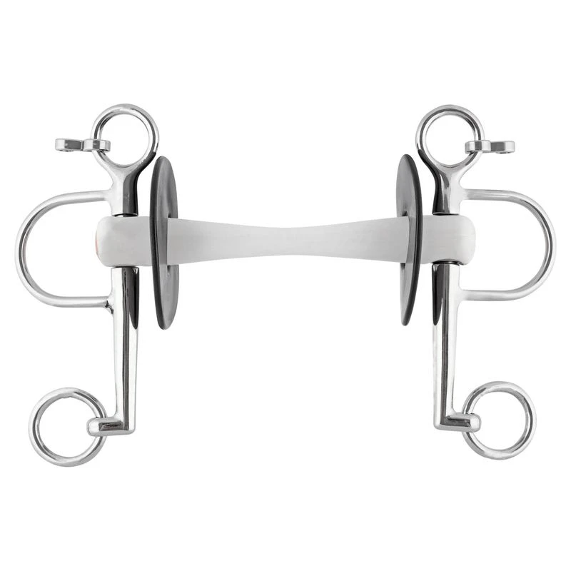 This bit features a flexible mullen mouth, with stainless steel pelham cheeks. Bit guards are included, curb chain is NOT included.