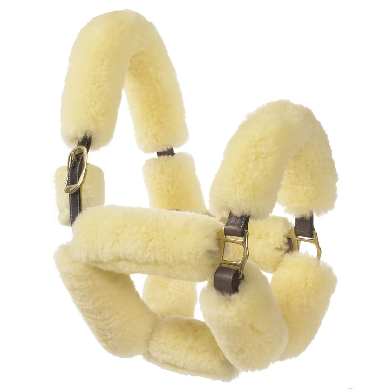 This leather halter is fully covered with pure natural sheepskin. It has 1″ wide leather and brass hardware. There is a two buckle crown and snap at the throat.