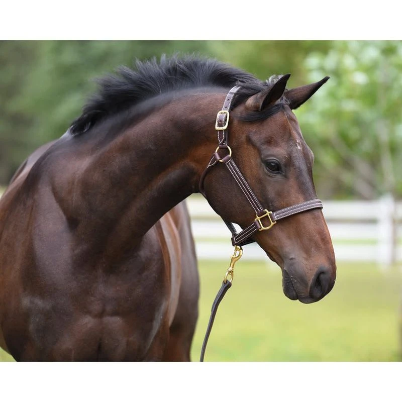 This classic show halter is triple stitched with white stitching, a fixed chin, and a snap at the throat. Made from Wickett & Craig eco-friendly veg tanned leather and top-quality solid brass hardware.