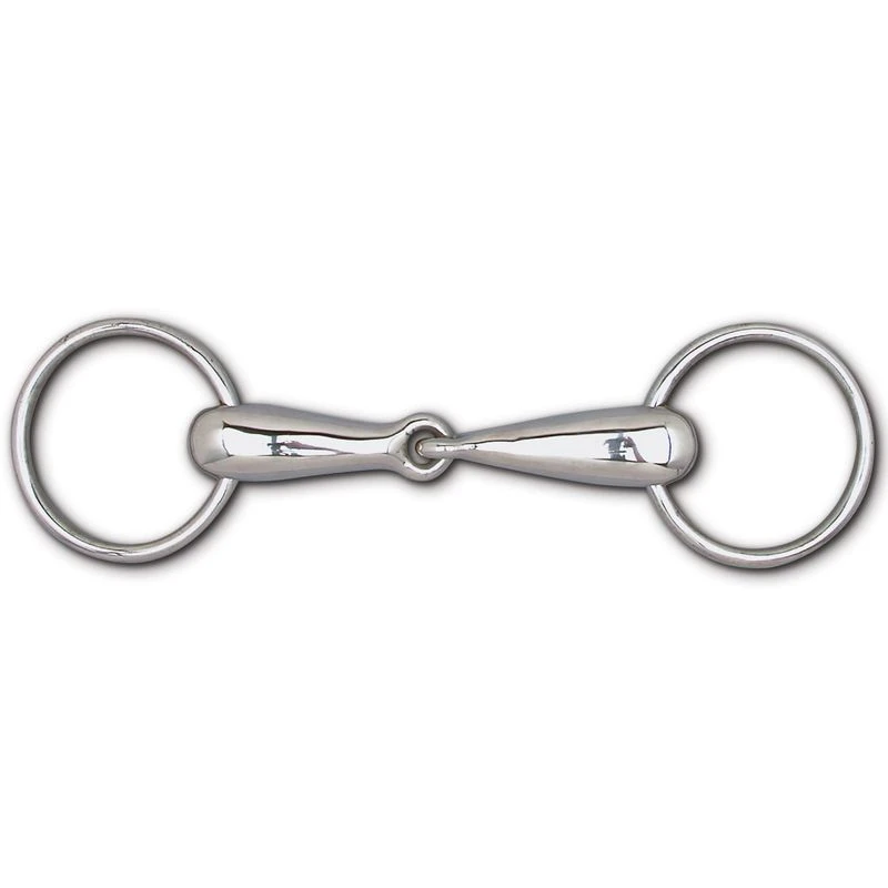 This bit has loose ring cheeks and a single joint hollow mouth.