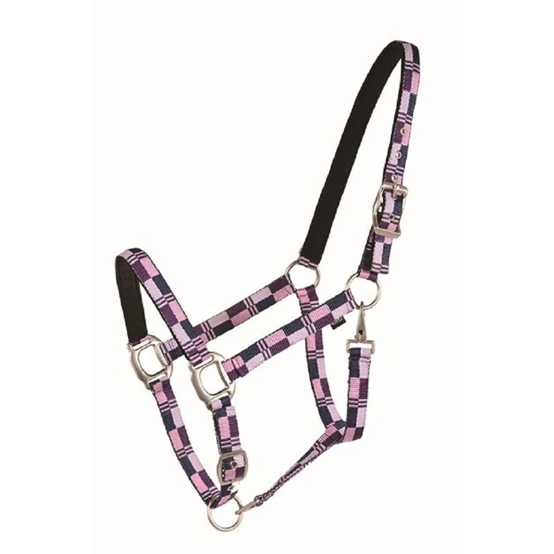 Polypropylene web halter featuring color coordinated plaid patterns, matte metallic finish hardware and Nubuck padding on crown and nose.
