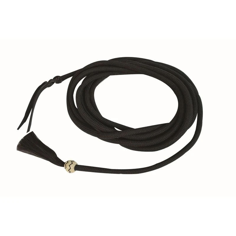 A premium mecate, perfect for the show ring and attached to the finest bosal, this 22′ mecate is enhanced by hair hair tassels and leather popper