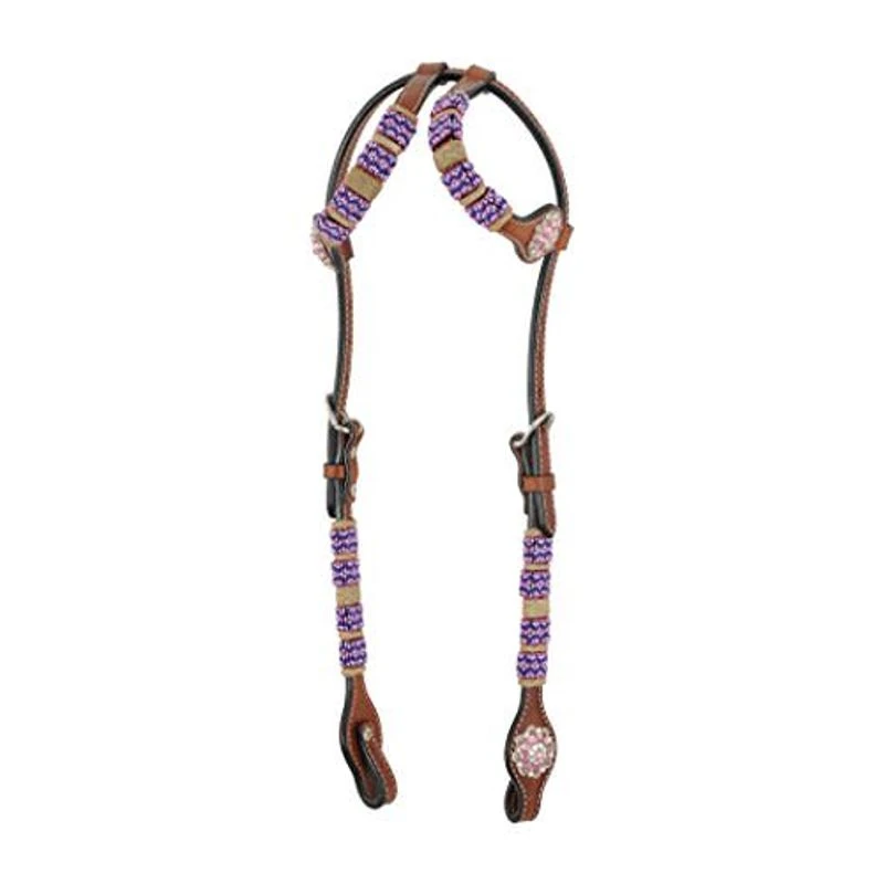 Gorgeous purple and pink beads enhanced by soft pink crystal conchos and contrast stitching give this Western double ear headstall a one of a kind style sure to stand out in a crowd.