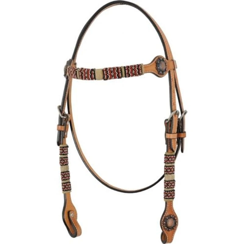This eye catching Western browband headstall, with bronze colored conchos, offers genuine cowboy style.