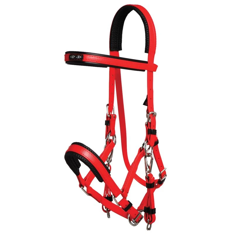 Features include Zilco’s patented synthetic material that is durable and will not stretch, crack, fade or discolor. Specially designed black PVC waffle material along the poll and noseband disperses pressure evenly for added comfort. Adjustable to fit smaller Arabs to full size horse breeds. Stainless Steel hardware. Replacement bit hangers also available (item 97-5009).